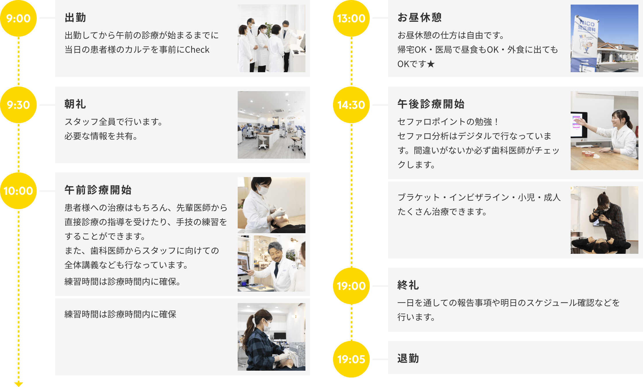 【平日】9:15~19:15 休憩時間90分(13:00~14:30) 【土日】8:15~17:15 休憩時間60分(12:00~13:00) |